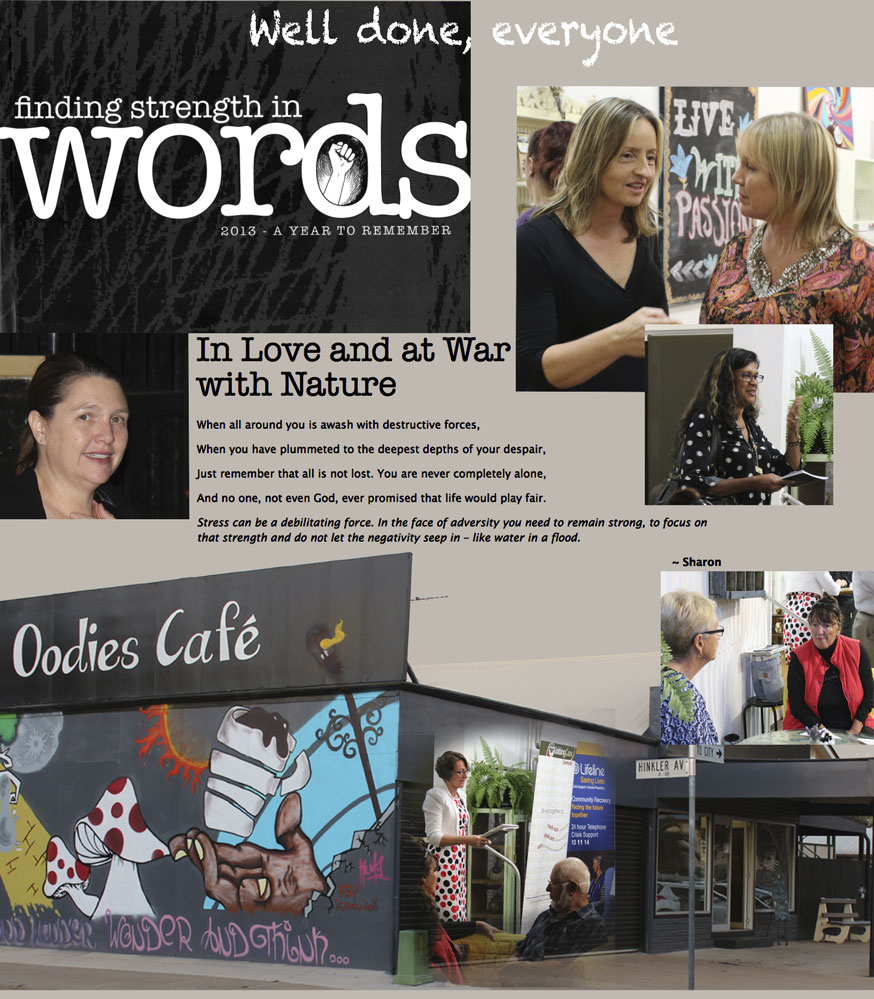 Our book Finding Strength in Words was launched at Oodies Cafe (103 Gavin St), in the company of the Mayor, no less (en route to a meeting I gather was flood related), Rotary reps, Ross P from the ABC and Sue Gammon (Bundaberg Library), Uniting Care reps Anne McWhirter, Angela Wilson and Margaret Wass, Creative Regions Shelley and Wendy and Ainsley and … well, you get the picture.
